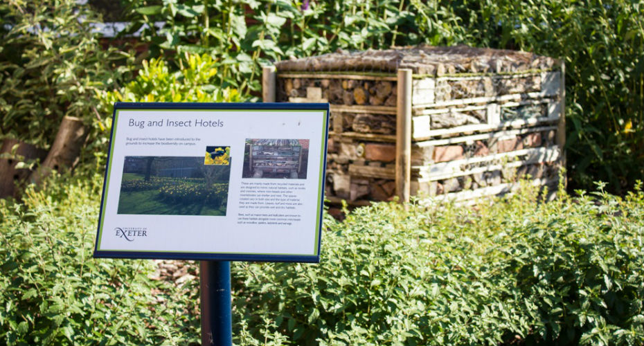 For Penryn, visit the Cornwall Sustainability Page. The information in the boxes below about bug hotels, etc., covers Exeter grounds only. You can find updates on Penryn Campus grounds and gardens on the Cornwall Sustainability pages.