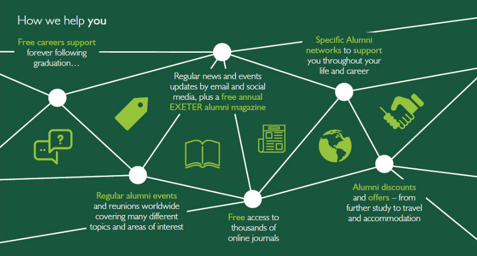 We're in touch with more than 155,000 alumni in 183 countries across the world. Exeter graduates have been making a positive difference to the lives of others for over 100 years. From internationally recognised business people and lawyers, to inspirational politicians and teachers, to critically acclaimed journalist and artists, this is a fellowship of friends and peers.