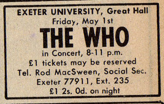"And one further story, not music related, was that in 1968 Enoch Powell came to give a speech in the Great Hall soon after his 'rivers of blood speech' in Birmingham. Exeter was a very conservative and sleepy Uni in those days but as soon as he appeared he was booed and heckled so that he had to abandon his appearance."