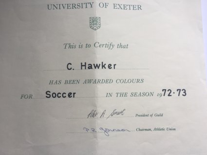 - Scoring with a long range header beating the Bath UAU keeper to draw level 4-4 towards the end of a fractious match against Bath University that saw Exeter down to ten men March 1971.