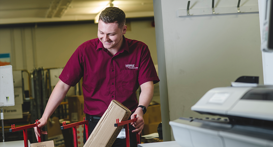 The Mail Room supports both Exeter campuses and links with the Penryn campus. The team support the majority of inbound/outbound mail and parcels for the university staff.