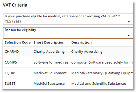When creating the requisition in T1, select the VAT drop down box in T1 as ‘yes’ and pick the relevant elgibility reason.