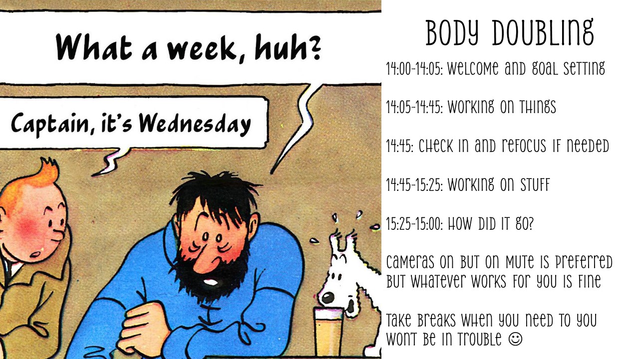 The Neurodiversity Café runs body doubling sessions 2pm to 3:30 pm alternating Wednesdays and Fridays. You can get invites by signing up for the Neurodiversity Café.