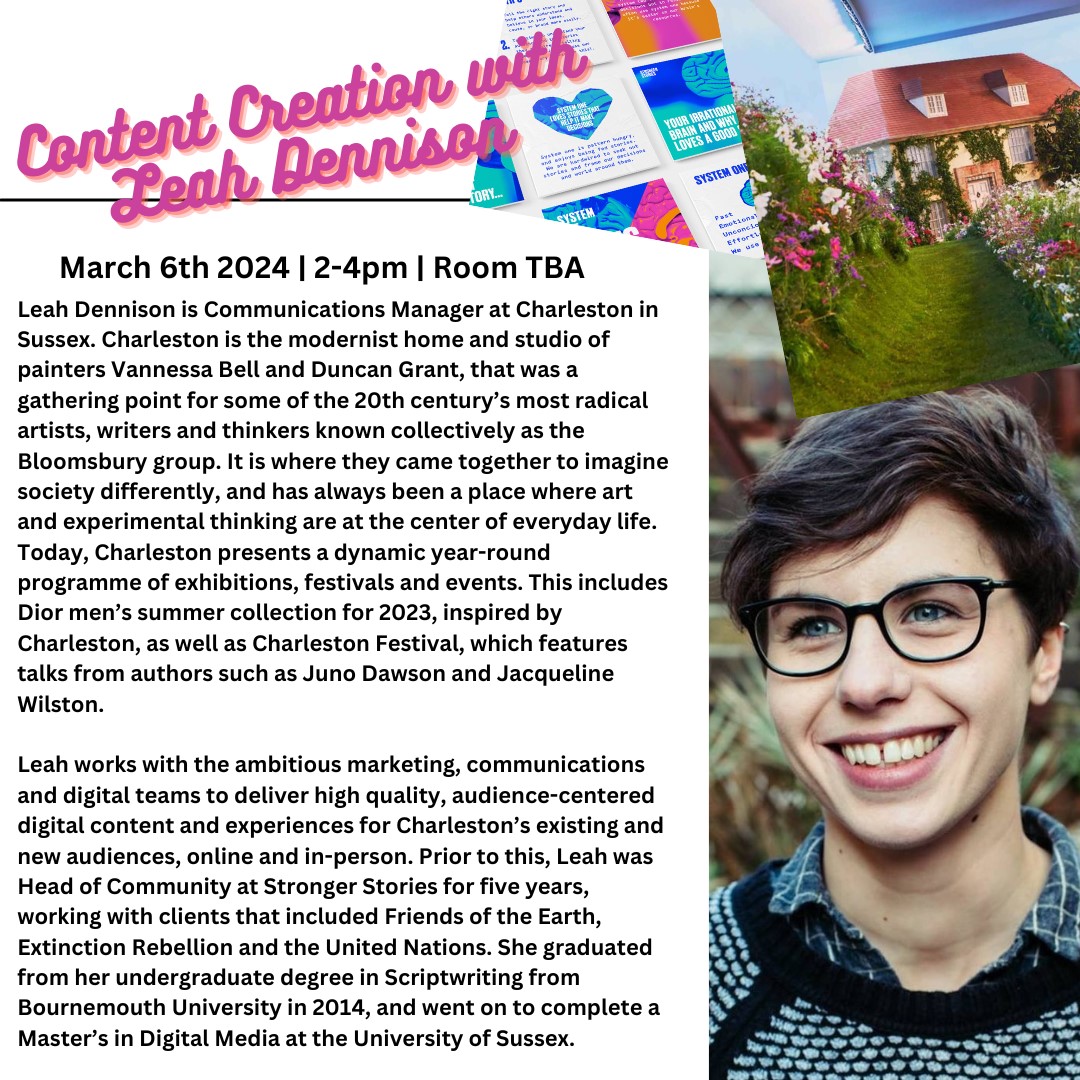 Information about Leah: Leah Dennison is Communications Manager at Charleston in Sussex. Charleston is the modernist home and studio of painters Vannessa Bell and Duncan Grant, that was a gathering point for some of the 20th century’s most radical artists, writers and thinkers known collectively as the Bloomsbury group. It is where they came together to imagine society differently, and has always been a place where art and experimental thinking are at the center of everyday life. Today, Charleston presents a dynamic year-round programme of exhibitions, festivals and events. This includes Dior men’s summer collection for 2023, inspired by Charleston, as well as Charleston Festival, which features talks from authors such as Juno Dawson and Jacqueline Wilston. Leah works with the ambitious marketing, communications and digital teams to deliver high quality, audience-centered digital content and experiences for Charleston’s existing and new audiences, online and in-person. Prior to this, Leah was Head of Community at Stronger Stories for five years, working with clients that included Friends of the Earth, Extinction Rebellion and the United Nations. She graduated from her undergraduate degree in Scriptwriting from Bournemouth University in 2014, and went on to complete a Master’s in Digital Media at the University of Sussex.