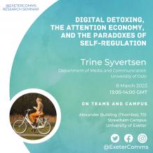 In this presentation, Trine Syvertsen will share observations from the research project Intrusive media, ambivalent users and digital detox (Digitox). The project studies intrusive media from the perspectives of history, politics, business and users.