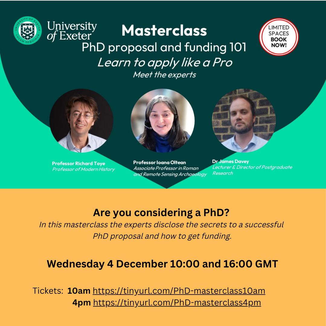 Learn how to write a PhD proposal, and apply for funding with this online masterclass. Our experts will discuss the main funding schemes available and offer advice on how to decide your next move. They will also cover the ideal PhD proposal structure and key things to include. There will be plenty of time for questions, and PGR involvement on the panel too. Hosted by the Archaeology and History department at the University of Exeter, we invite all those who are interested in the PhD application process. We look forward to seeing you there!
