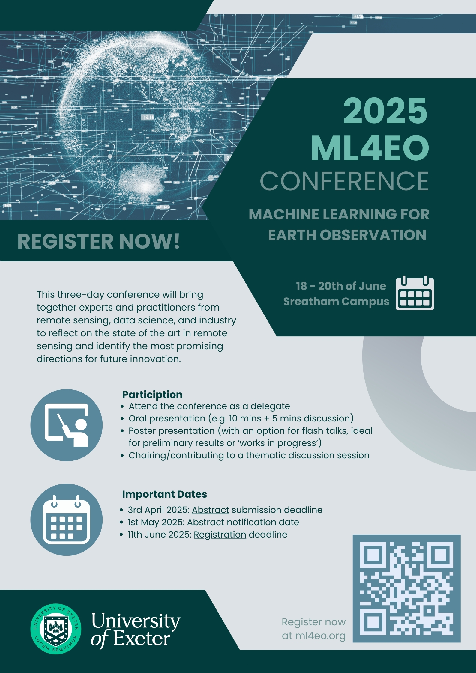 Building on the success of the two previous workshops, this three-day conference will bring together experts and practitioners from remote sensing, data science, and industry to reflect on the state of the art in remote sensing and identify the most promising directions for future innovation. Hosted at the University of Exeter, the event welcomes participants from academia, the public sector, and industry, at all career stages, to create a vibrant research community. Attendees can look forward to keynotes, oral and poster presentations, panel discussions with industry leaders, a conference dinner, and training workshops on cutting edge skills and hands-on AI/ML for EO practice.