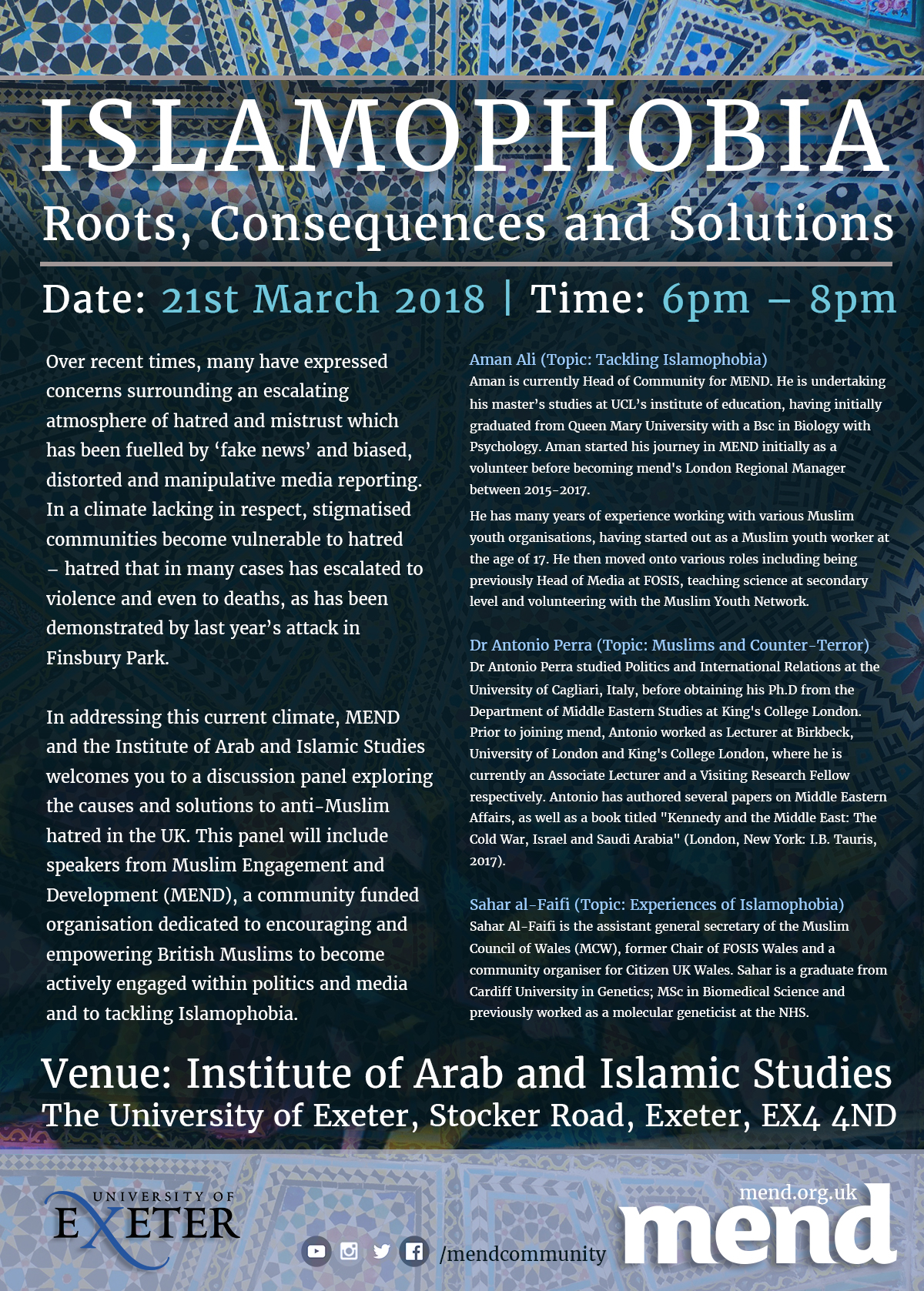 Over recent times, many have expressed concerns surrounding an escalating atmosphere of hatred and mistrust which has been fuelled by "fake news" and biased, distorted and manipulative media reporting. In a climate lacking in respect, stigmatised communities become vulnerable to hatred - hatred that has in many cases escalated to violence. In addressing this current climate, MEND and IAIS welcome you to a discussion panel exploring the causes and solutions to anti-Muslim hatred in the UK. All are welcome and tea/coffee will be served in the IAIS Common Room from 17:15.