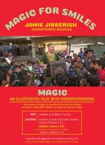 You are warmly invited to come along to hear his fascinating illustrated talk, with demonstrations, about the value of magic in the lives of refugee and other children living in exceptionally deprived circumstances in Lebanon.