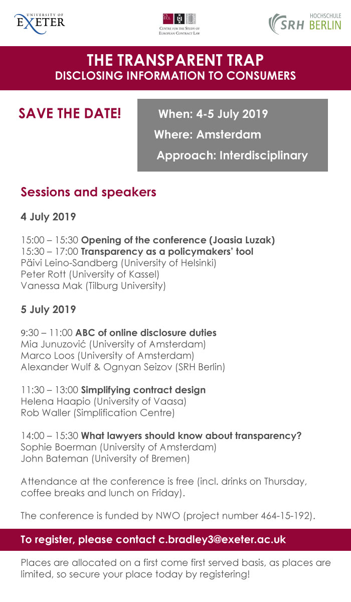 The Centre for the Study of European Contract Law at the University of Amsterdam, SRH Hochschule Berlin and University of Exeter are organising together an international, interdisciplinary conference "The Transparent Trap: Disclosing Information to Consumers" on 4-5 July in Amsterdam.