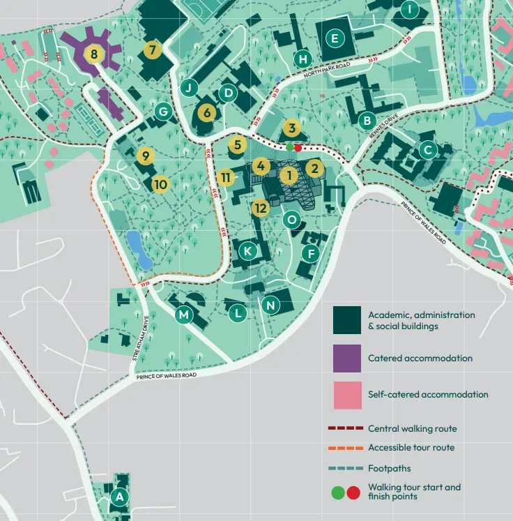 Use the virtual map below, or help yourself to a physical Self-Guided Tour map from any of our building receptions and student hubs. Follow the numbered circular route around some of our key buildings on campus. Walk to any of the Buildings of Interest depending upon your chosen subject or interest. These are marked with letters on the map. Click on a building name in the dropdowns below to virtually see inside buildings and find out more.