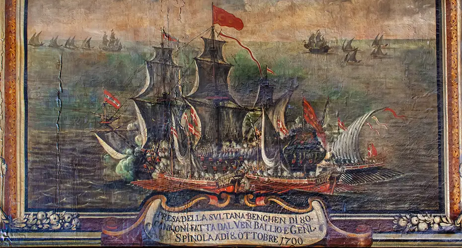 But the study takes us beyond the text. Related to the capture of the Sultana, we find a painting depicting the conflict between the Ottoman and the Knights of St John’s naval vessels at the Grand Master’s palace in Valletta; a second is found in the Palazzo Falzon, Mdina; and a third similar depiction at the Maritime Museum in Genova, Italy. These paintings all point to how important the capture of the Sultana was to the Order.