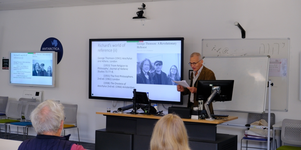 One of the hallmarks of Richard’s scholarly originality was to try to understand what made Greek society work at its most fundamental levels, and how these ideas and practices then shaped this society. That is, he believed that only by understanding the social, religious, political and economic phenomenology of Greek society could one understand its literary, artistic and philosophical outputs. For example, he understood tragedy as an essentially ritual and religious activity which was also political, and the development of the abstraction implicit in the economic phenomenon of ‘money’ as the precursor to the abstract thinking of the pre-Socratic philosophers.