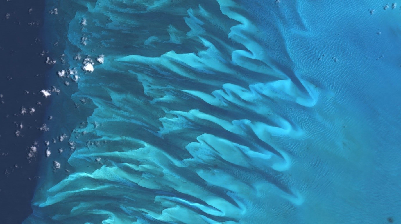 An image of underwater sand dunes and ripples on the Great Bahamas Bank, made using optical data collected by the ESA Sentinel-2 satellite.