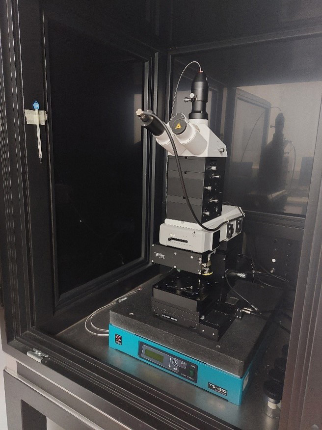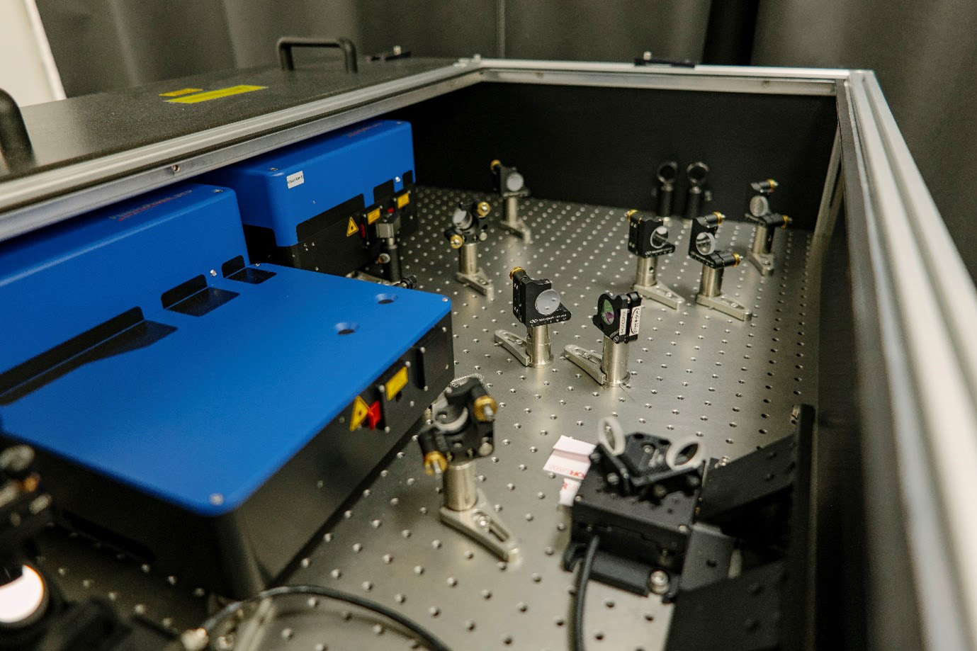 This custom-built micro-spectrometer provides two- and three-dimensional mapping of biomolecules based on their unique Raman fingerprint. Based on broadband coherent anti-Stokes Raman scattering this system provides a combination of speed, sensitivity and spectral breadth. The system utilizes a configuration of laser sources that probes the entire biologically relevant Raman window (500–3500 cm–1). By utilising intra-pulse three-colour excitation and the non-resonant background to heterodyne-amplify weak Raman signals it is possible to obtain efficient acquisition of the typically weak ‘fingerprint’ region.
