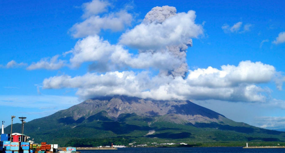 An eruption of Sakurajima volcano, viewed from the nearby city of Kagoshima