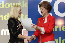 Dr Claire Belcher receiving her Marie Curie Award from Androulla Vassiliou, the European Commissioner for Education, Culture, Multilingualism and Youth