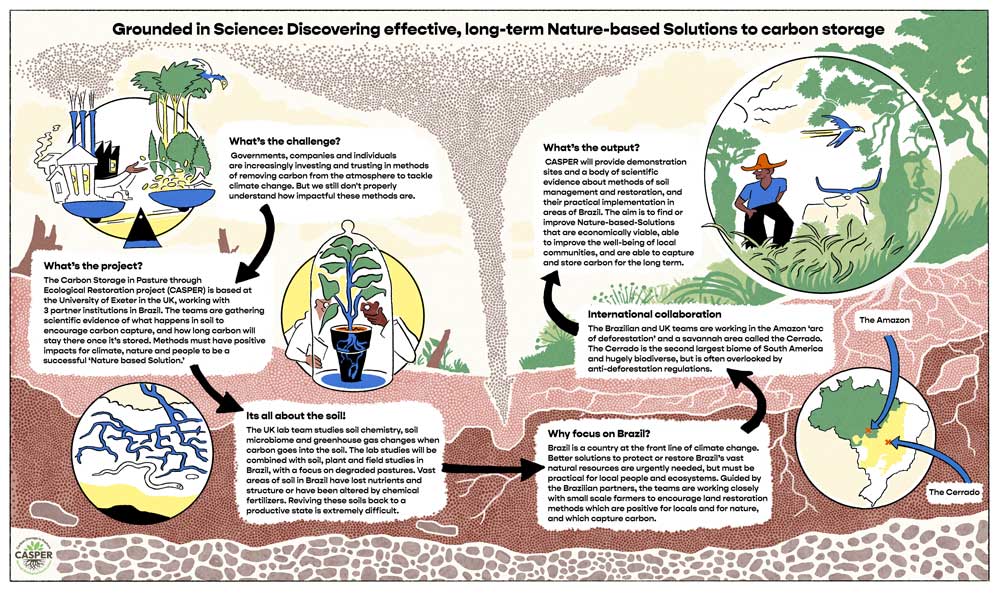 Working in Exeter and in Brazil, the CASPER team is studying what happens in soil to encourage carbon storage, and how long carbon will stay there once it’s stored. CASPER aims to substantially advance understanding of how plant-microbe soil interactions and agricultural management practices impact the potential for carbon sequestration.