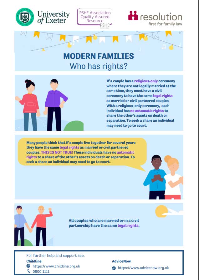 While recognising that families come in all shapes and sizes, in helping to dispel some of the myths and misconceptions around ‘common law marriage’ and ‘non-qualifying ceremonies’, the teaching will help pupils make informed decisions about future relationships. Enabling pupils to make such informed decisions is a requirement of the RSE Statutory Guidance and the PSHE Association’s Programme of Study 2020.