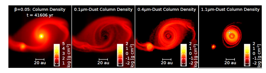 In Bate (2022), I began investigating dust growth during the early stages of star formation, the first time this had been studying in three-dimensional hydrodynamical simulations. Over the past two years my ex-PhD student, Daniel Elsender, and I have developed the methods required to model both dust growth (using the Bate 2022 method) and dust dynamics (a combination of Elsender & Bate 2024 and Hutchison et al. 2018). The next step, and the main focus of this PhD project, is to perform simulations of the formation of isolated stars, multiple star systems, and eventually the formation of stellar groups/clusters in which the gas and the dust are evolved together, to understand in much greater detail how planet formation begins in young discs and how the observed dust structures may arise.
