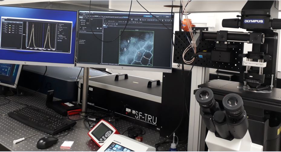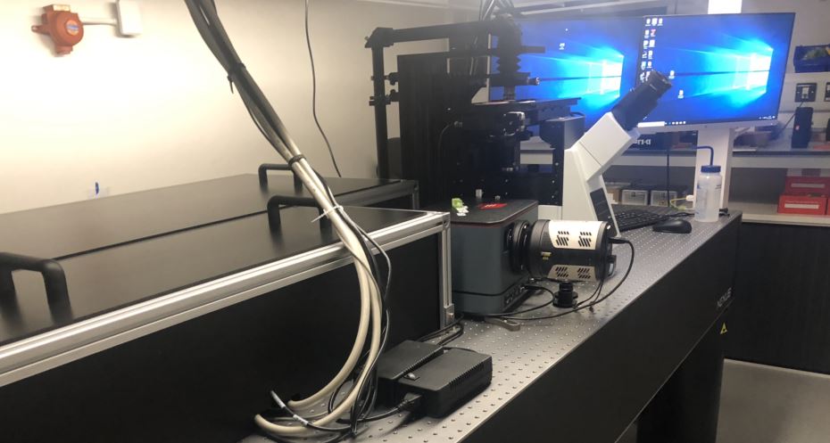This system is powered by an InSightX3 fs laser, which provides a tuneable output between 680-1300nm and a fixed wavelength output at 1045nm. The 2 beams are combined in the SF-TRU spectral focusing unit. This unit controls the laser powers applied to the sample, the time delay between the beams. It also provides the intensity modulations in the Stokes beam necessary for SRS and chirps the beams from fs to ps pulses. The imaging is carried out on a modified confocal inverted microscope (Olympus Flouview3000 and IX81). The light is focused on the sample with a 1.2NA water objective and transmitted light is collected with either an oil or water condenser depending on the sample type. For transparent samples SRS and CARS are measured in the forwards direction, however for thicker samples there is also an option to collect backscattered CARS in an epi channel. In this lab we have the ability to combine Coherent Raman imaging with complementary techniques including Second Harmonic Generation SHG and Two Photon fluorescence (TPF), which will provide complementary information about the collagen structures and endogenous fluorophores or added fluorescent labels within a sample. The system is set up for 3D imaging, large area scans and rapid hyperspectral imaging.