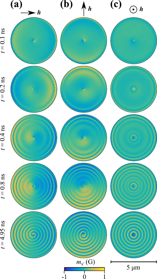 Calculated distributions of the dynamic out-of-plane component of magnetisation in a magnetic disk for the indicated time delays after the onset of (a) horizontal, (b) vertical and (c) out-of-plane uniform magnetic field of 12.5 GHz frequency [from C. S. Davies et al, Phys. Rev. B 96, 094430 (2017)].