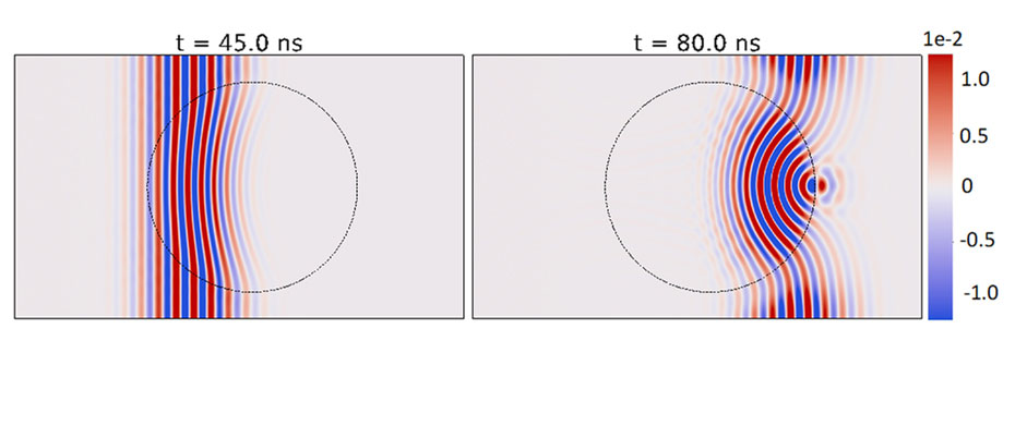 Snapshots of a spin-wave packet propagating through a magnonic Luneburg lens (dotted outline). The colour scale shows the dynamic magnetisation and is saturated for clarity.