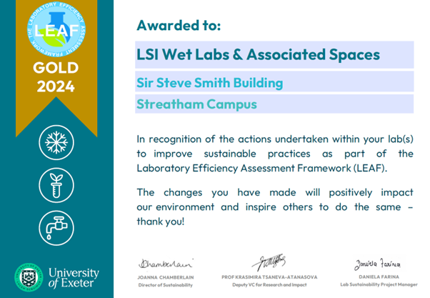- LEAF (Laboratory Efficiency Assessment Framework) Gold (2024), LEAF Silver (2022) and LEAF Bronze (2021)