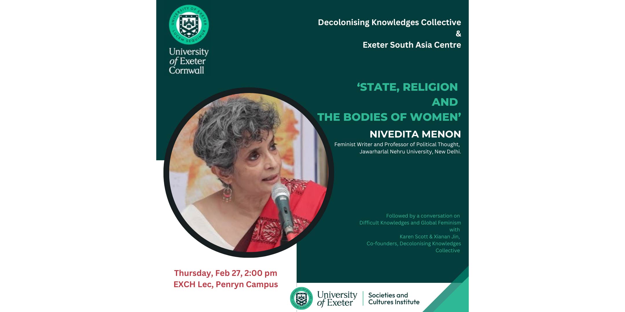 As part of our Visiting Researcher scheme, we are excited to announce that we are collaborating with Exeter’s South Asia Centre to host Professor Nivedita Menon (Jawaharlal Nehru University, Delhi) at the University of Exeter from 25 - 28 February.