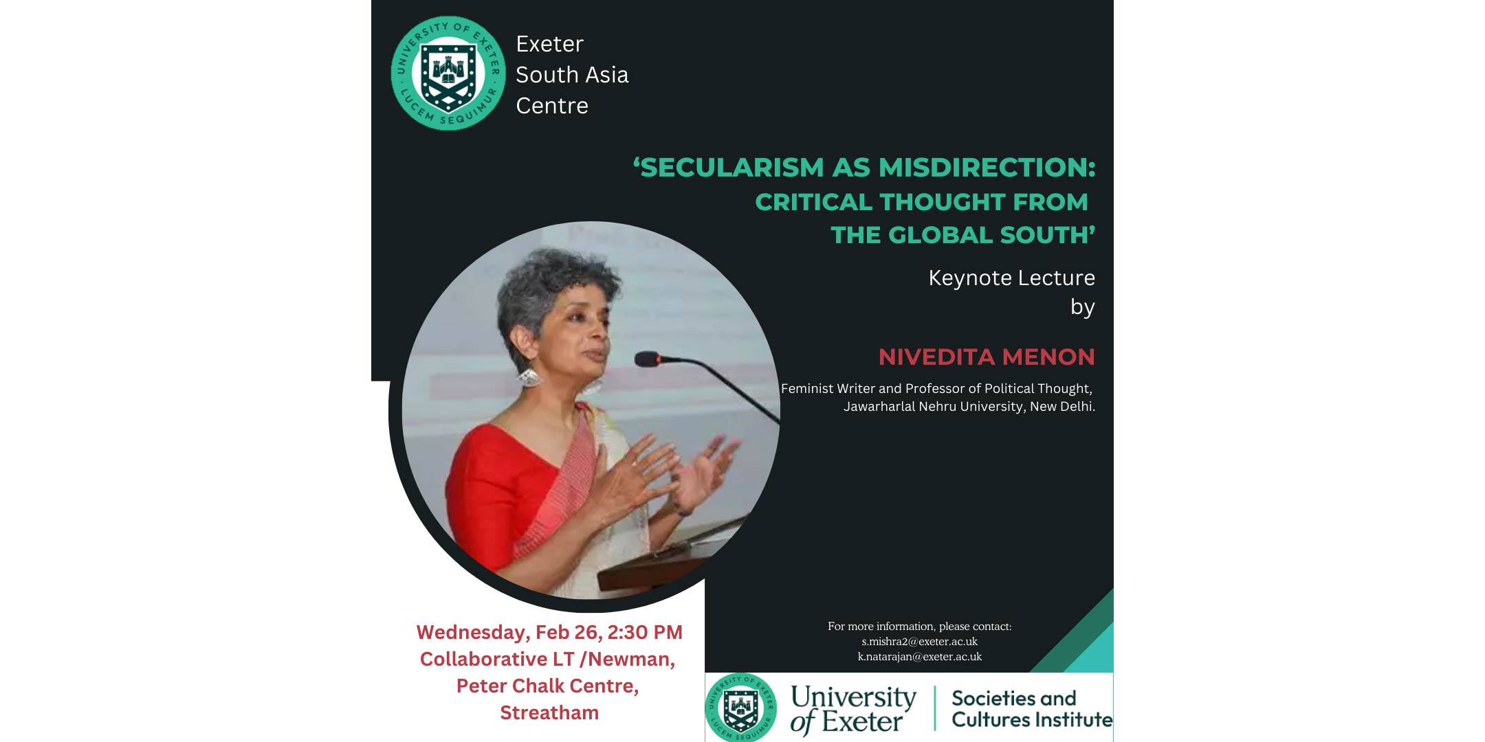 As part of her visit to Exeter, she will deliver two keynote lectures that draw on her recent book Secularism as Misdirection: Critical Thought from the Global South (2024). Her other books include the acclaimed Seeing Like a Feminist (2012) and Recovering Subversion: Feminist Politics Beyond the Law (2004). Prof Menon’s interdisciplinary, multi-lingual, critical research and public interventions have significantly enriched intersectional feminist scholarship and activism.