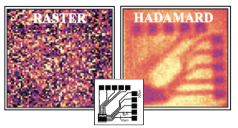 This means that arrays of detectors (like those found in digital cameras) are not suitable. Instead we use a single pixel along with a silicon wafer to make a dynamic THz metamaterial mask, where shining light on the silicon makes it behave like a metal4. Patterning the light by using a reconfigurable array of small mirrors (a digital micro-mirror device) means that we can create regions of the silicon that are metallic and regions that are not. This dynamic metamaterial allows us to record many pixels simultaneously, increasing the signal by orders of magnitude and allowing us to collect clearer images much faster than with conventional raster scanning5. This is clear in the comparison of THz images of a circuit board in Figure 3.