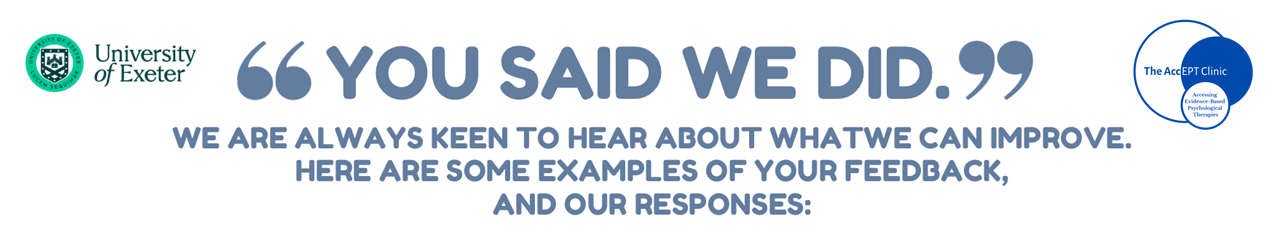 We appreciate your feedback. You can collect a feedback form from reception after your first visit to the Service. At the end of you treatment you will be invited to complete a survey on your experience of treatment here. In the meantime you can call or email us with any comments: 01392 723493 / accept.clinic@nhs.net