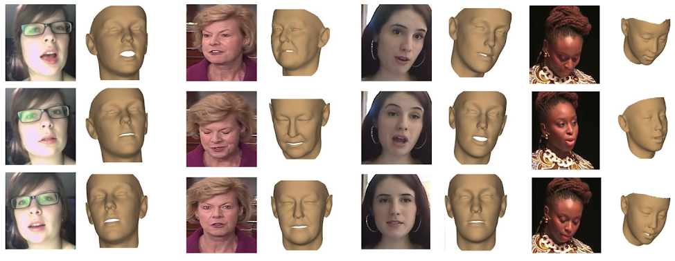 Fig.1: Reconstruction results produced by our method on four dissimilar videos concatenated column-wise along with the generated 3D faces. Each row depicts a frame from one video and to its right is the corresponding reconstructed 3D face.