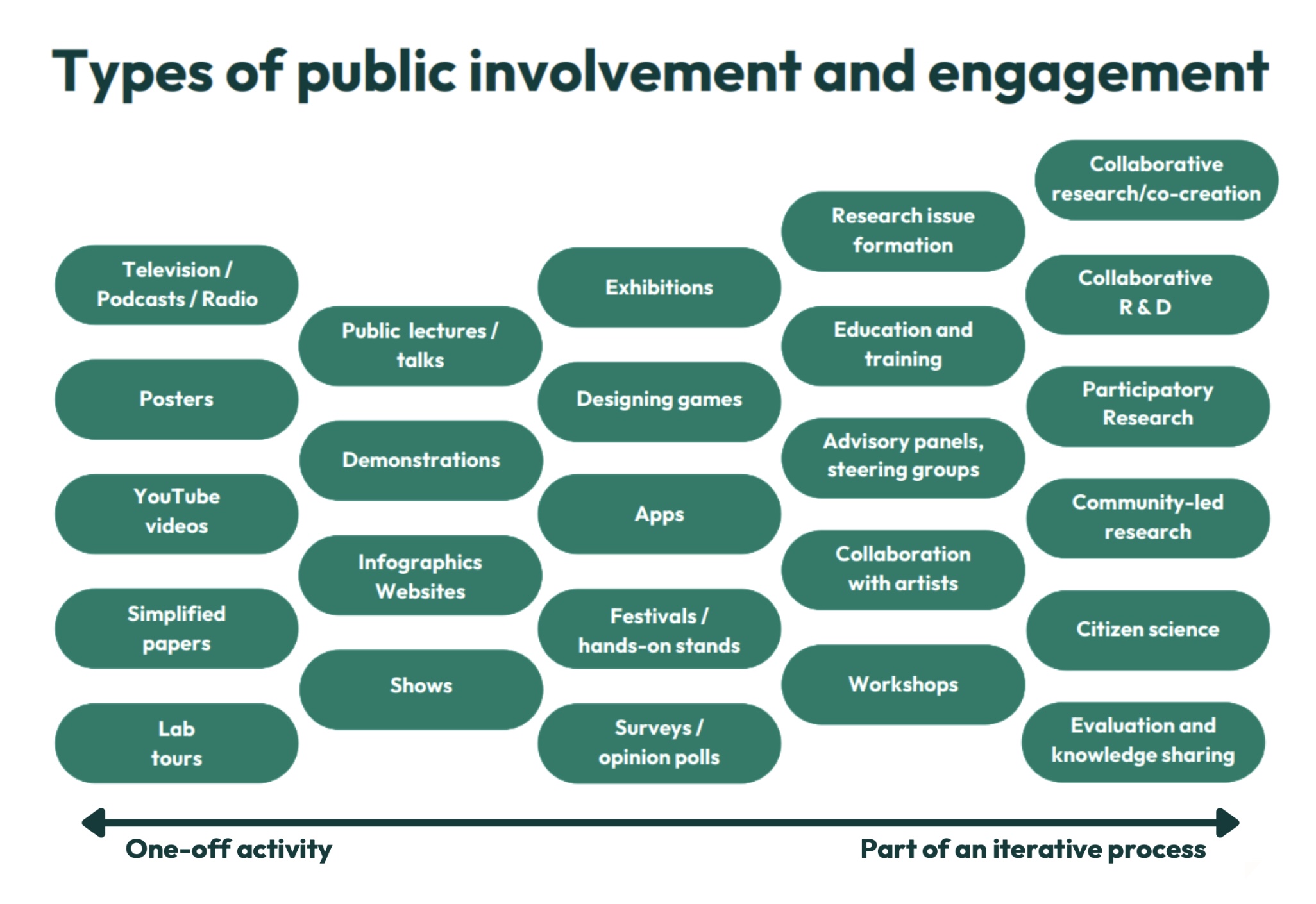 "Public engagement includes any activities that seek to break down the barriers between research, innovation and society. This can include collaborative research, patient and public involvement (PPI), public dialogue, activity at festivals, museums and science centres, schools engagement, and much else."