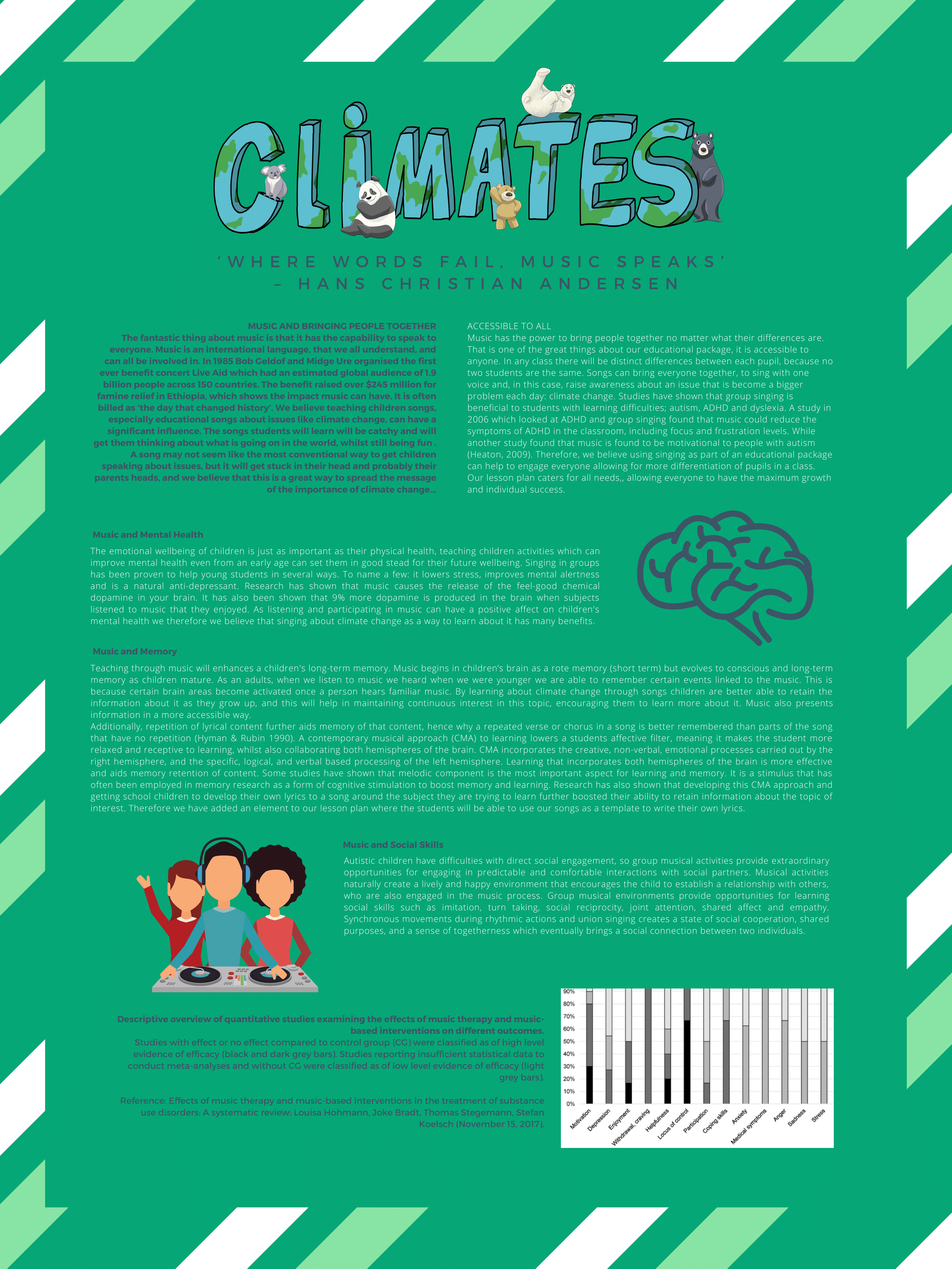 This group decided that music has the power to bring people together no matter what their differences are. They created an educational package, which is accessible to anyone, to be used in schools. The package is called "CliMates" which involved different bear characters, which includes detailed lesson plans including colouring activities for teachers to educate classes about the climate. To go with the lesson plans, they created a music video with interactive educational lyrics to engage the children in the material. Songs bring everyone together and in this case, raise awareness about an issue that is become a bigger problem each day: climate change. The aim of their project was to use singing as part of an educational package to help to engage everyone allowing for more differentiation of pupils in a class. Their lesson plan caters for all needs, allowing everyone to have the maximum growth and individual success.
