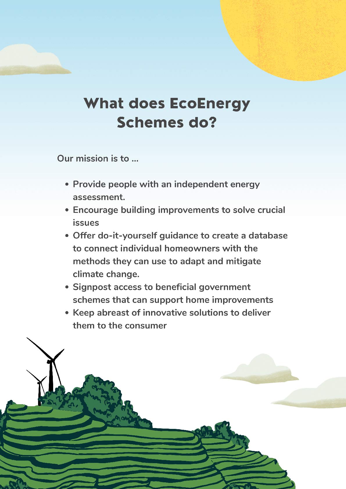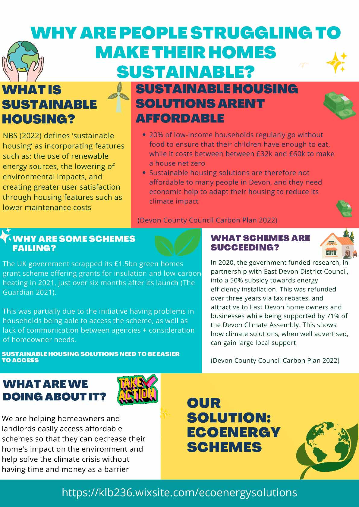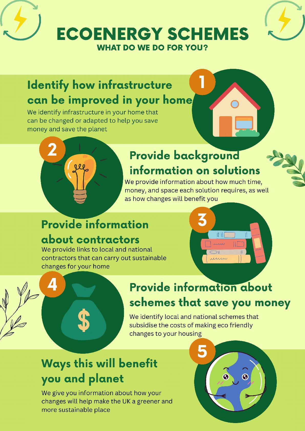 This group created a website that would act as a hub for schemes to improve home energy efficiency. EcoEnergy created a business plan that explained their plans to compile the schemes created by the government, local councils, and private businesses that provide advice and money to individuals wanting to improve the energy efficiency of their homes.