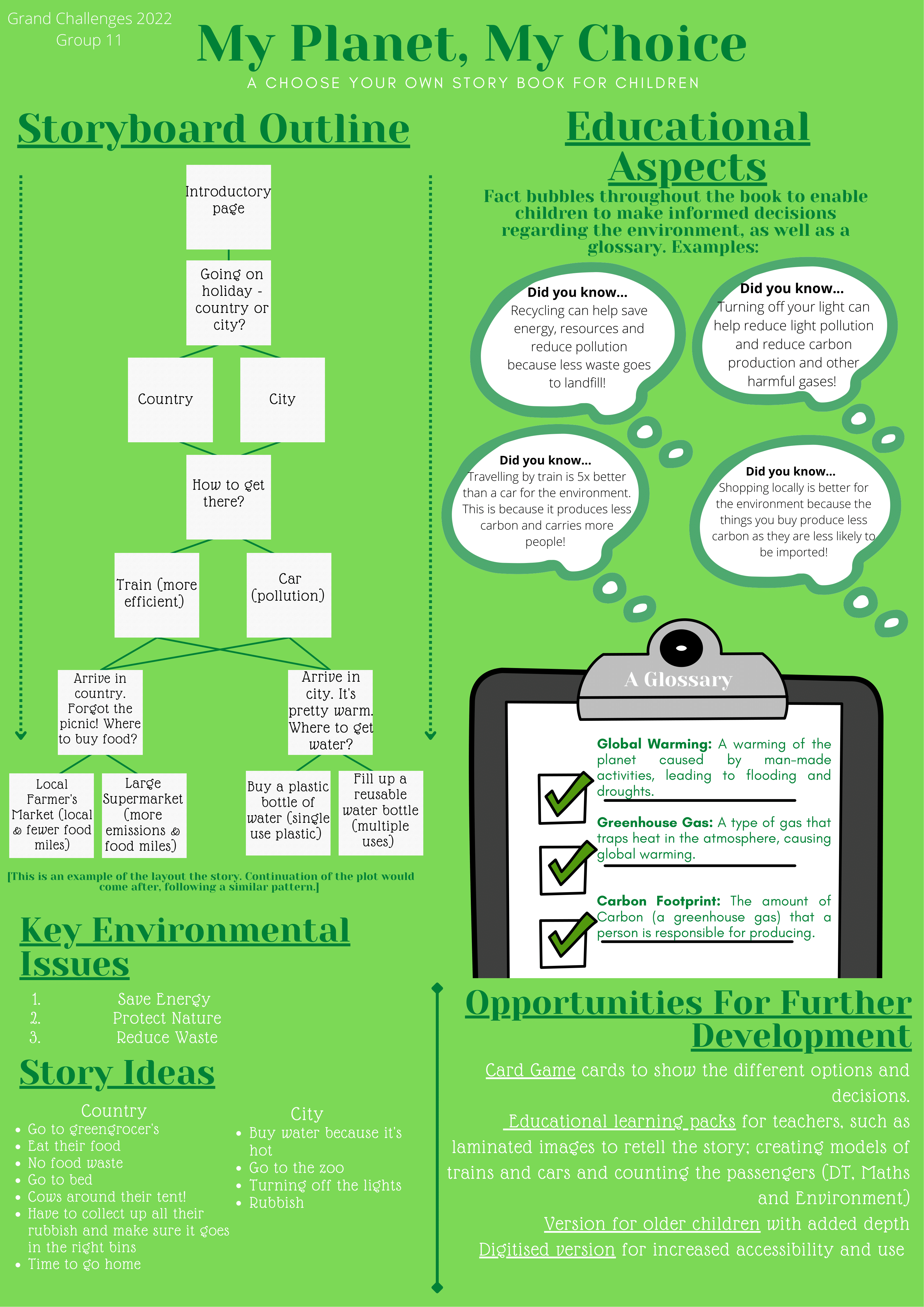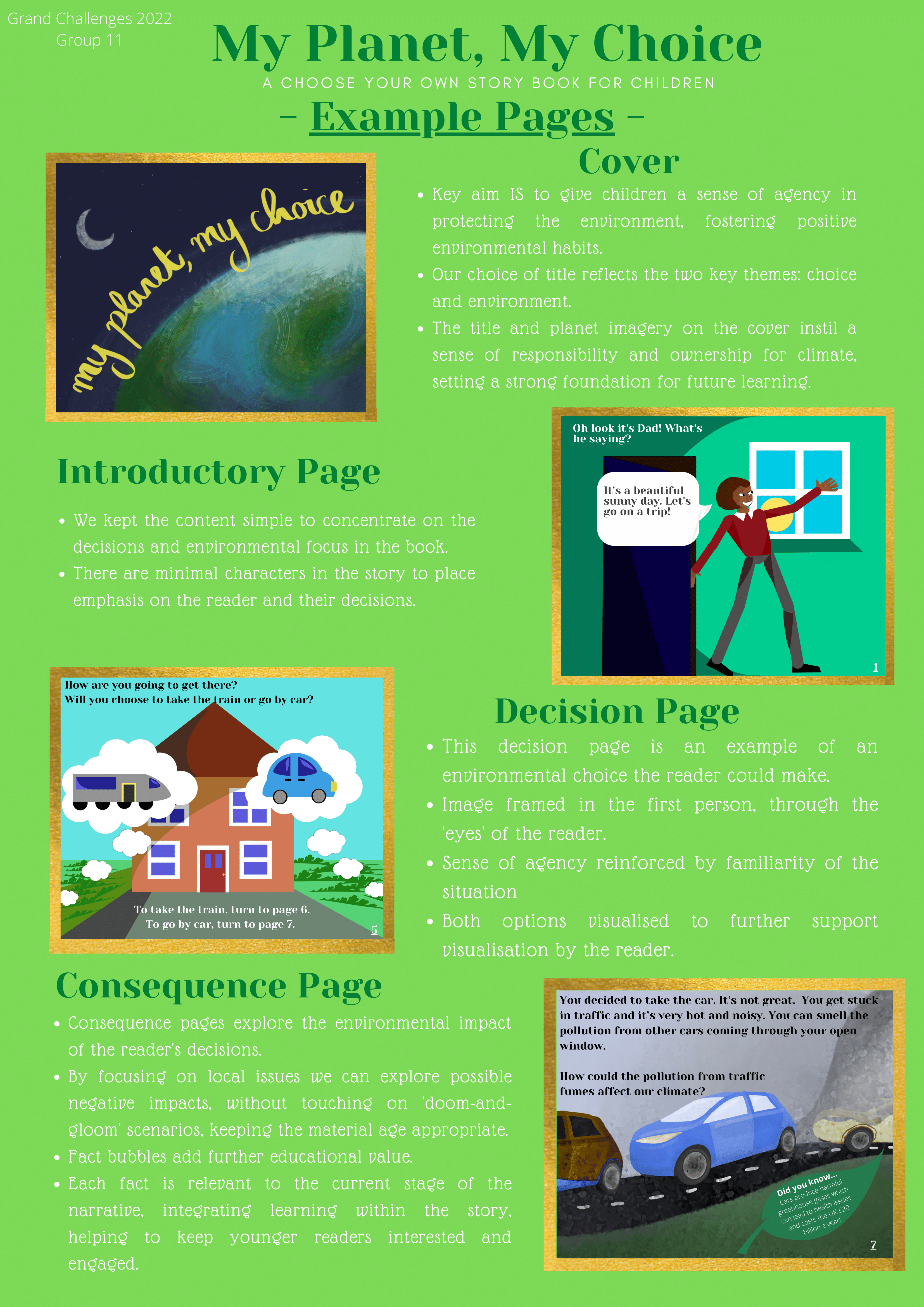 This choose-your-own-adventure storybook follows a family taking a trip for the weekend, asking the reader to make small decisions, where one answer is more environmentally friendly than the other. This aims to educate children aged 4-7 about making smarter choices, with a focus on saving energy, protecting nature and reducing waste through a series of ‘fact bubbles’, a glossary, and ‘consequence pages’, which explain the environmental impact of the reader’s choice. The group then saw the potential for further development with a card game expansion, educational learning packs for teachers that could accompany the book if it were sent out to schools, a version for older children or a digitised version.