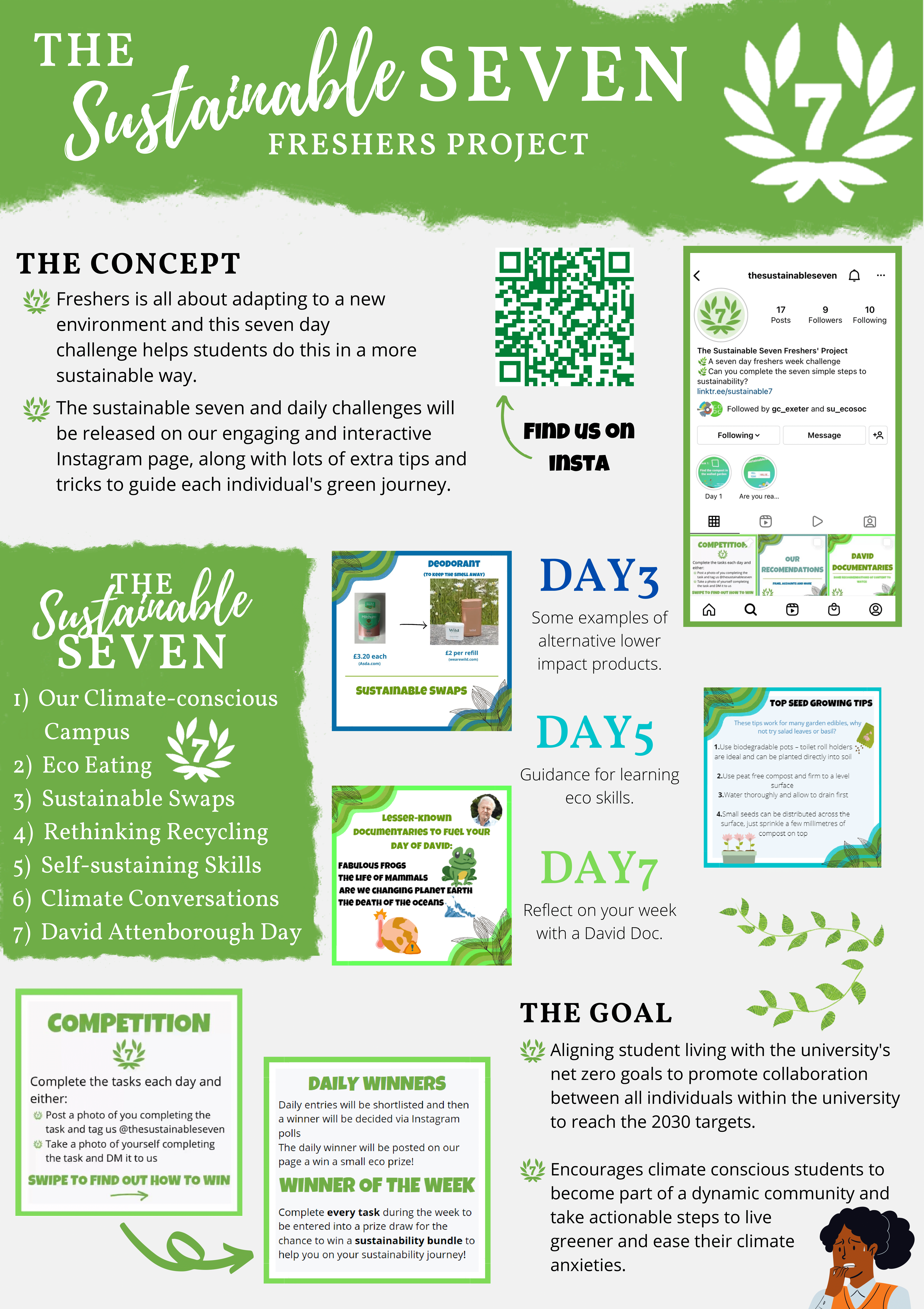 The Sustainable Seven shares resources via their Instagram that aim to align students with the University’s net zero goals and encourage climate conscious students to become part of a community. The resources they share include seed growing tips, sustainable swaps and sharing climate-based media. The name ‘seven’ comes from the fact that completing each day’s sustainable action is seen as part of a week-long competition to win a sustainability bundle when you share what you’ve done with those running the project. There are also daily competitions to further encourage participation.