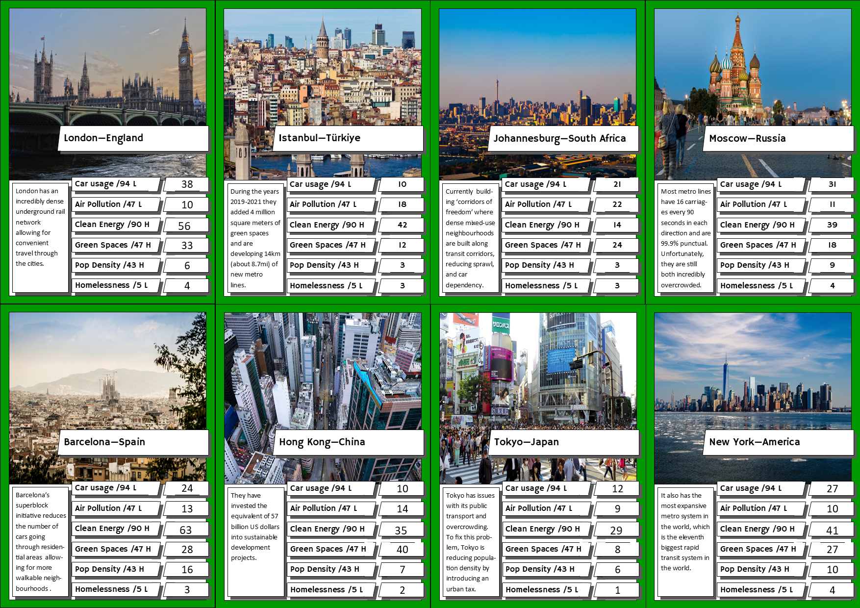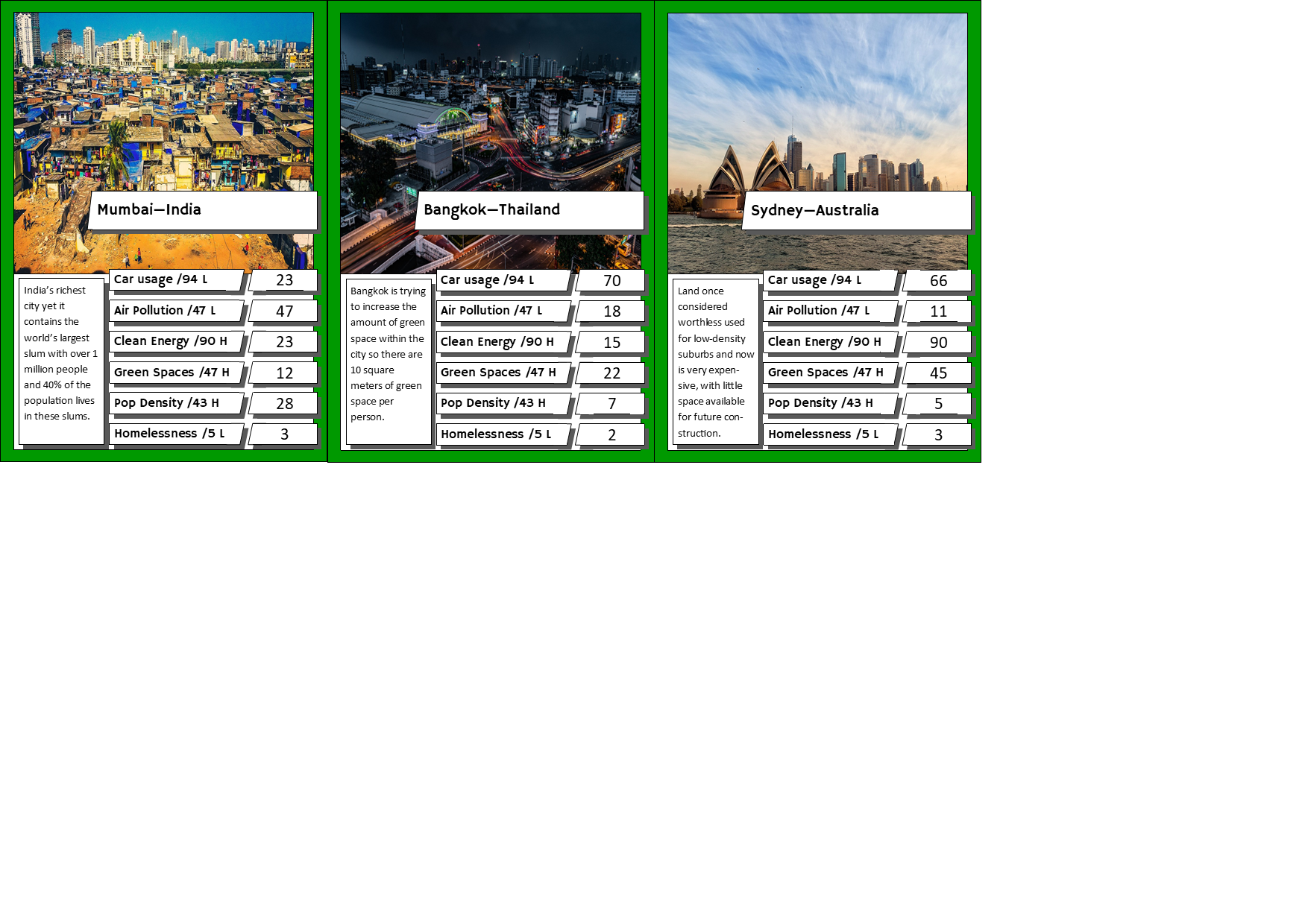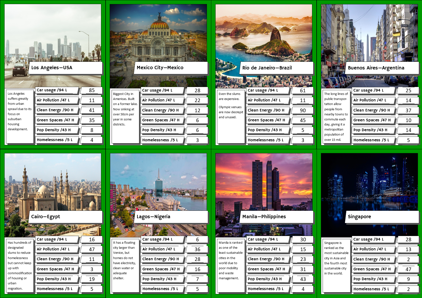 This project uses the familiar children's game Top Trumps and utilises the form to use in an educational context for secondary school children with categories of comparison such as car usage, air pollution, clean energy, green spaces, population density and homelessness. Using these categories, the player is able to learn and compare cities within each category, assisting in learning.