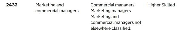 In Column 1 you will see a 4 digit code (this is known as the SOC 2020 code) and a general job category in Column 2. In the example above, the SOC 2020 code is 2432 and the job category is ‘Marketing and commercial managers’. Column 3 is a list of job titles that are considered to fall into that job category and code. These are not the only job titles that can come under that category, they are just some common examples.