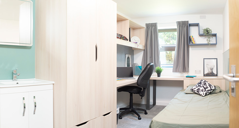 There are 70 single standard rooms arranged in flats of five bedrooms with a shared kitchen/diner, lounge, enclosed shower cubicle and separate toilet. A sink is provided in each bedroom.