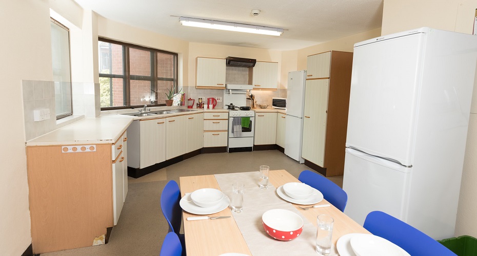 The shared kitchens in Rowancroft Mews have a cooker with oven, grill and electric plate hob, microwave, fridge/freezer, kettle, dining table, chairs and an ironing board.