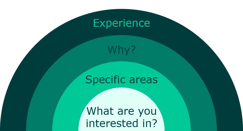 You can create your own rainbow diagram or simply write notes for each heading. This will help you pin down your knowledge and interests related to the subject. It can help you convey that you’ve undertaken your research and really thought through your decision.